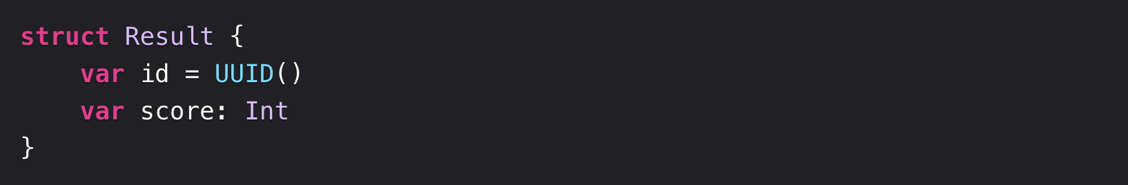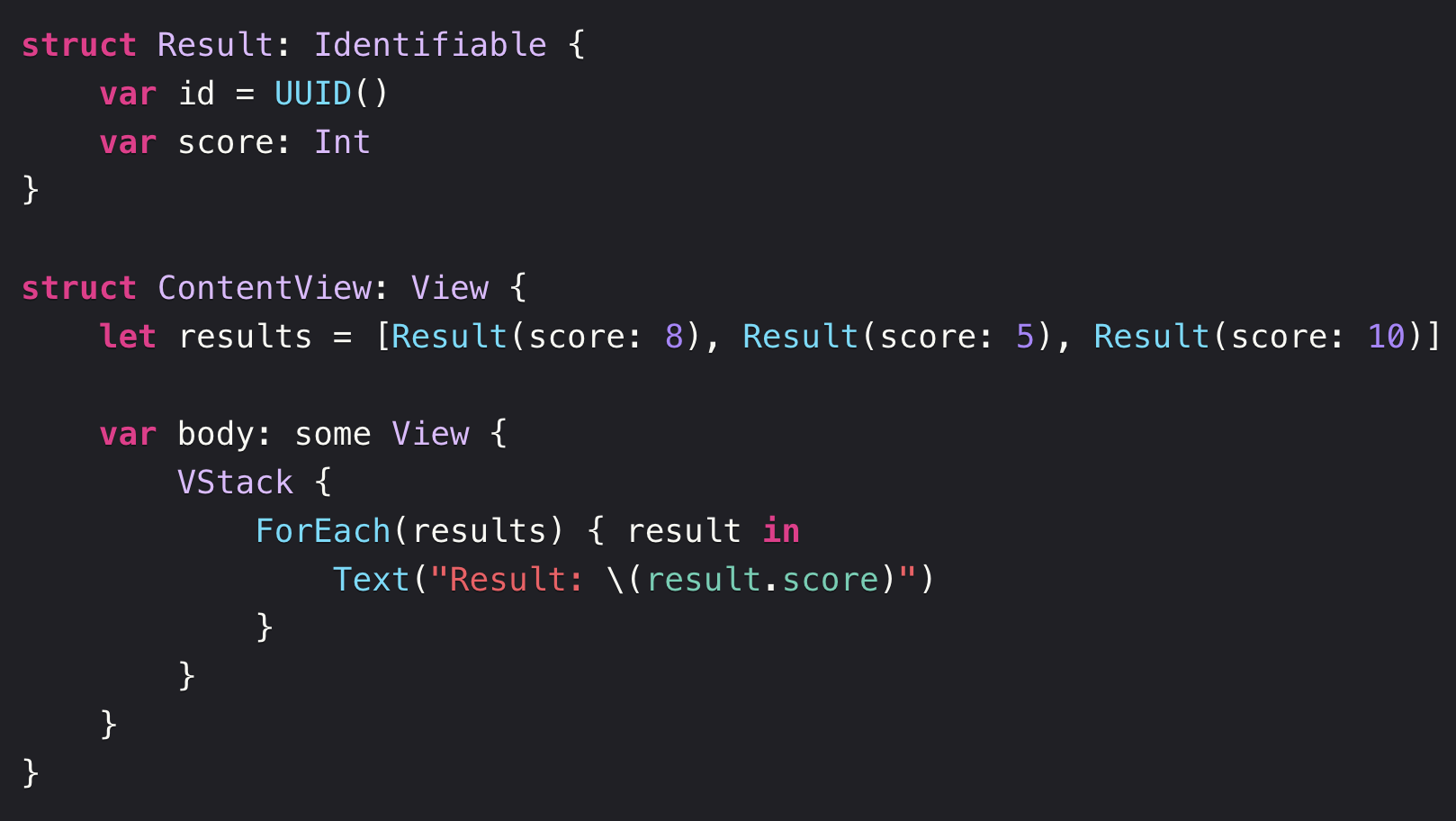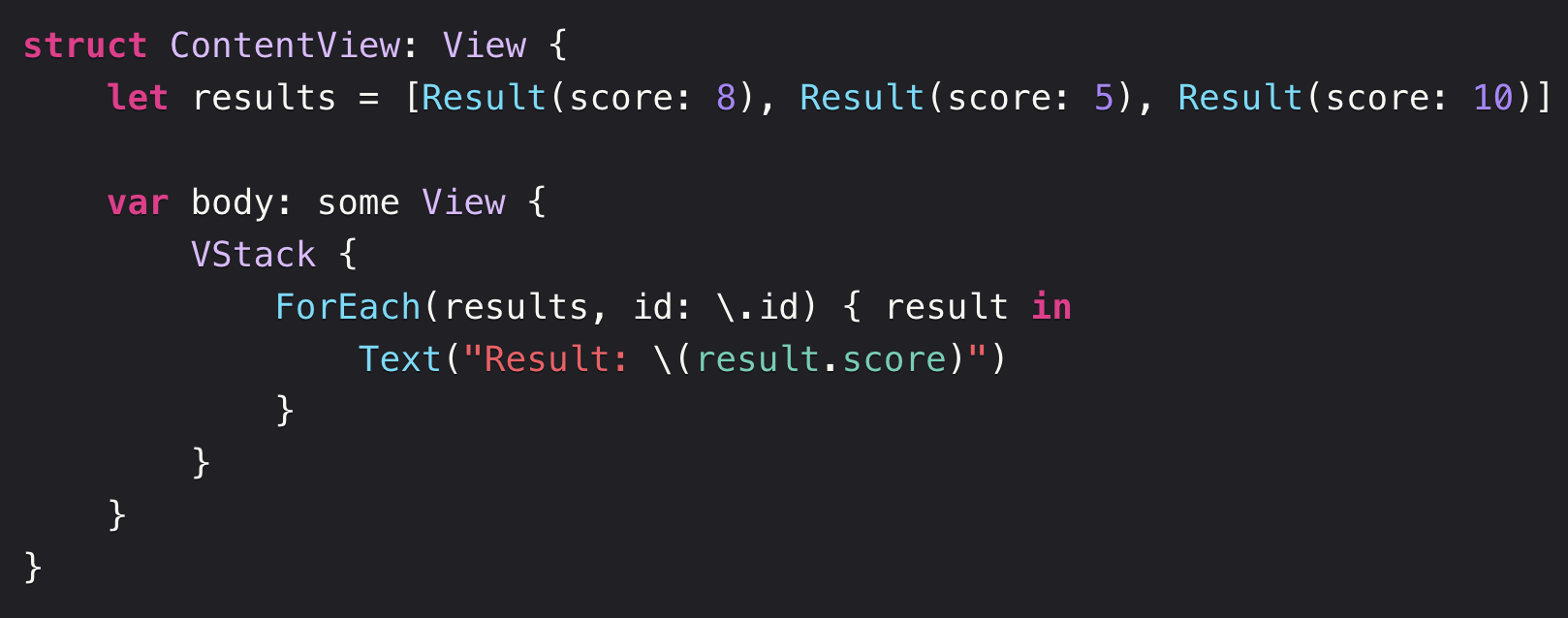 대안으로, Identifiable 프로토콜을 준수하는 Result 를 만들었을 경우에 id(: \.self) 를 제외한 ForEach() 를 사용할 수 있습니다.