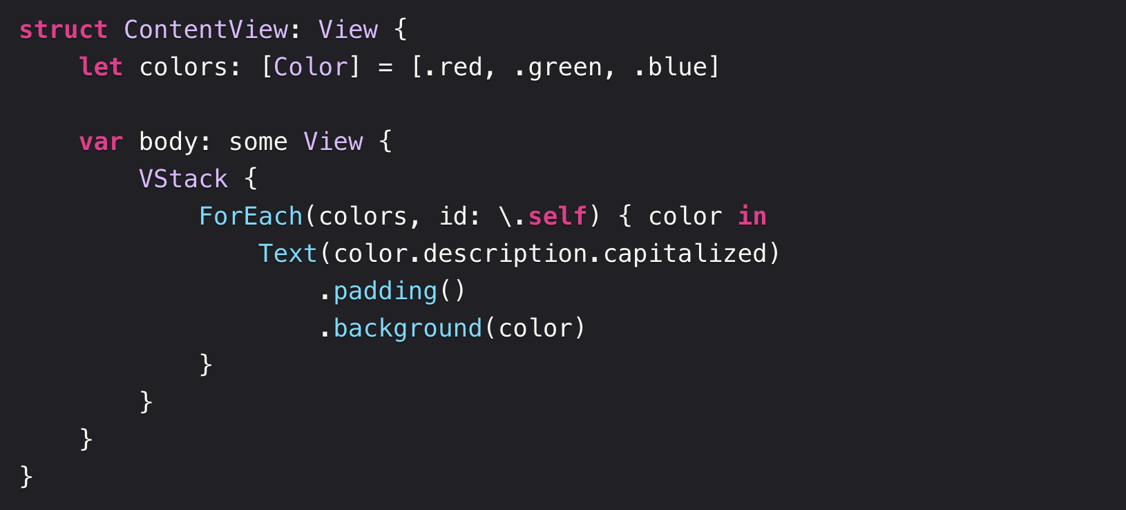 위의 id(: \.self) 은 SwiftUI가 배열의 각 요소를 고유하게 식별 할 수 있도록하기 위해 필요한 부분입니다.
